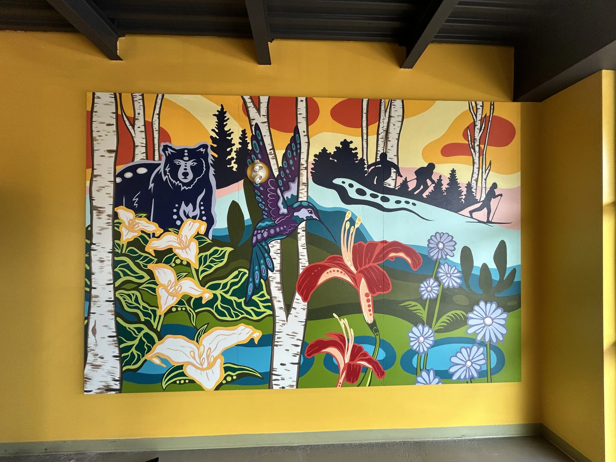 A series of murals intended to highlight the essence of this region and to bring vibrant colours to the spaces that they will live in. Three pieces are located in the staff hub, dining hall, and general foyer on the main floor.