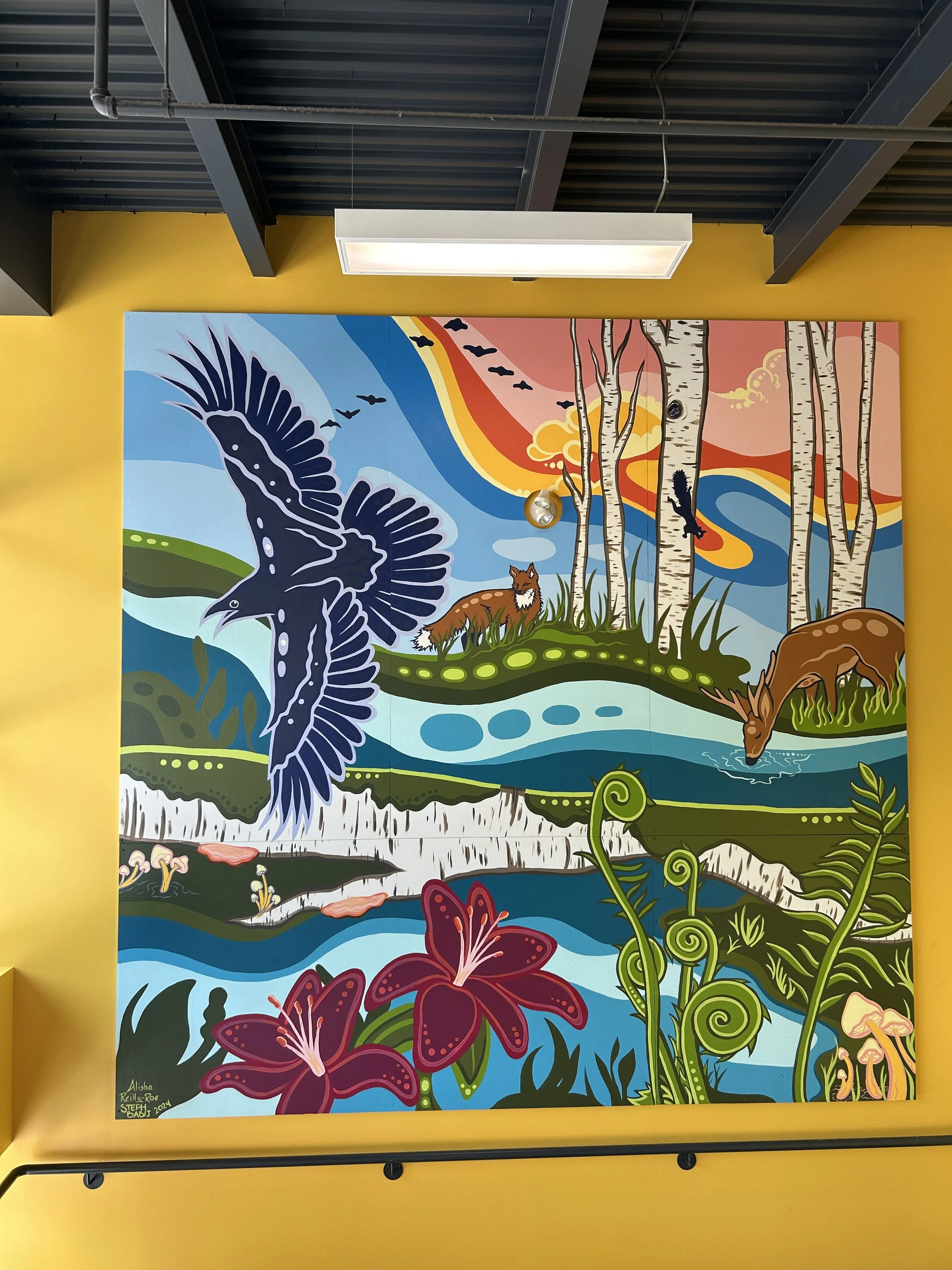 This mural was created as part of the Downie Wenjack Fund for a Legacy Space. The aim of IGM’s Downie Wenjack Legacy Space is to honor IGM’s commitment to Indigenous and non-Indigenousreconciliation in Canada and specifically with regards to ‘Call to Action 92’ of Canada’s ‘Truth and Reconciliation Commission. The intention is to create a space of education and inspiration primarily for IGM employees around Indigenous reconciliation while also being a space where local indigenous communities, partners, and employees feel welcome and represented in the spirit of reconciliation.